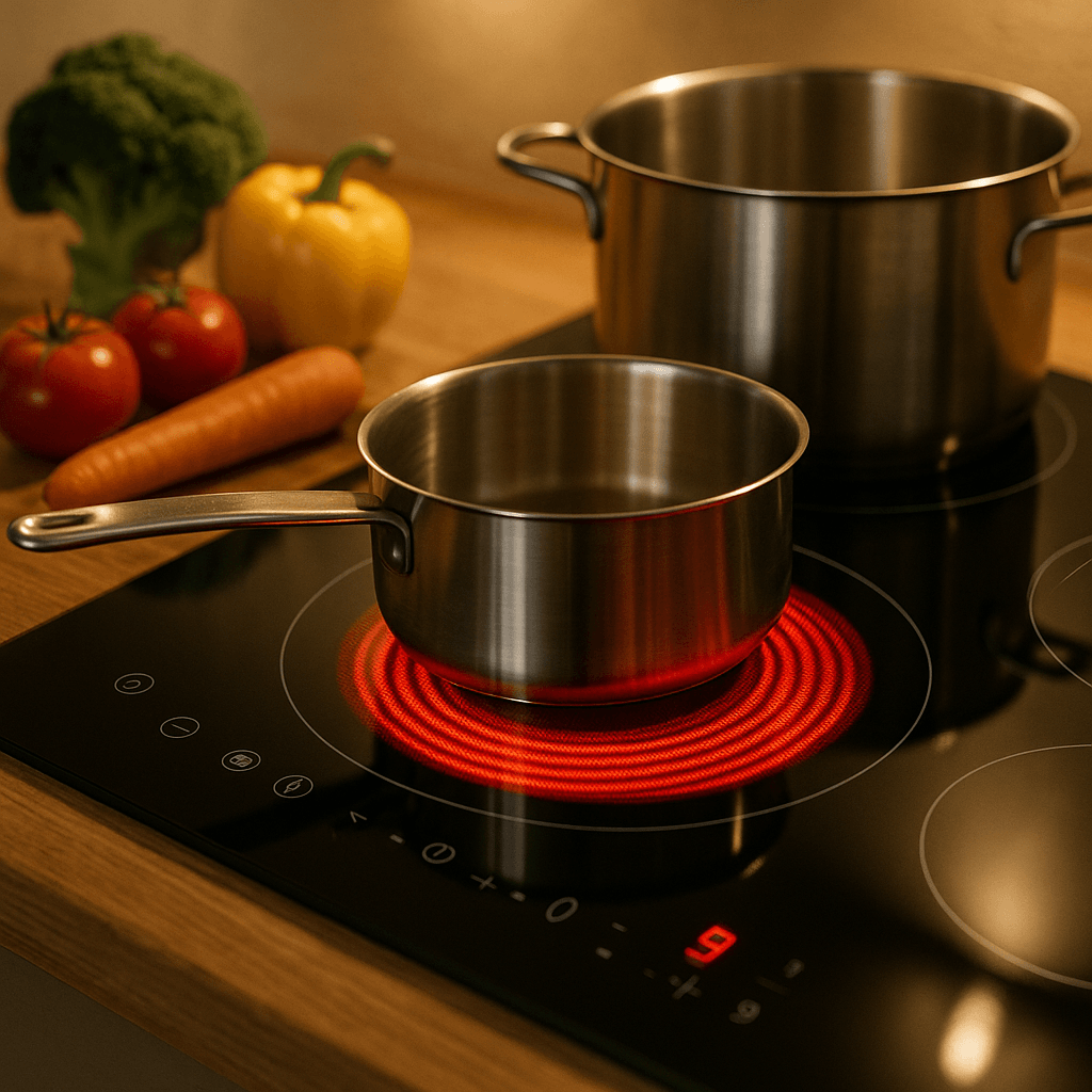 Les plaques vitrocéramiques chauffent grâce à une résistance électrique située sous une surface en verre céramique, semblable à un radiateur. Lorsqu’elles fonctionnent, la zone devient rouge, signe du rayonnement thermique. Un point à retenir : la chaleur persiste après l’arrêt.